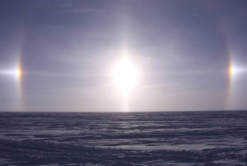 幻日(sun dogs)是大气的一种光学现象。在天空出现的半透明薄云里面,有许多飘浮在空中的六角形柱状的冰晶体,偶尔它们会整整齐齐地垂直排列在空中。当太阳光射在这一根根六角形冰柱上,就会发生非常规律的折射现象。